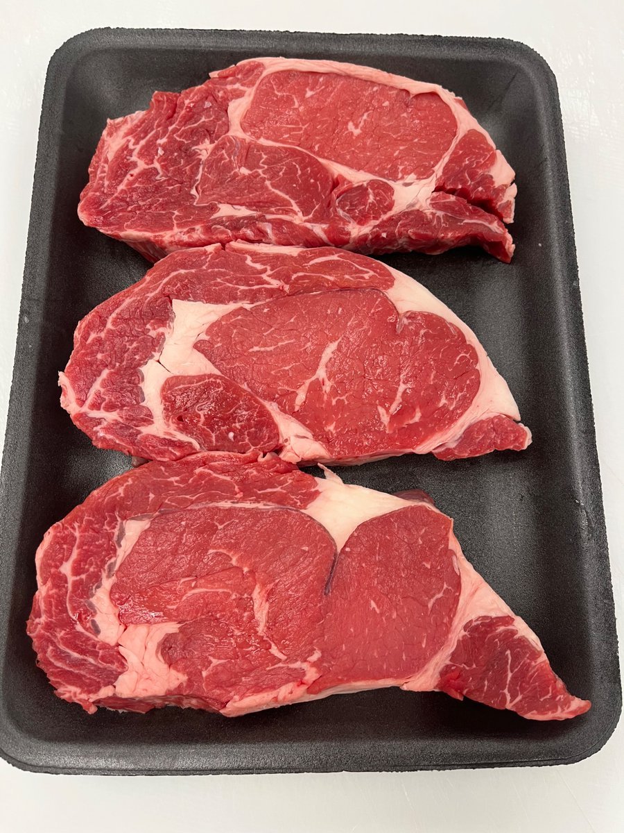 The king of steaks is the ribeye, aka Delmonico. There's not much connective tissue to worry about but the bottom steak has a tiny bit in the center. The top steak has the coveted spinalis muscle on the left side and that's the best of the three here. #2 is the middle steak.