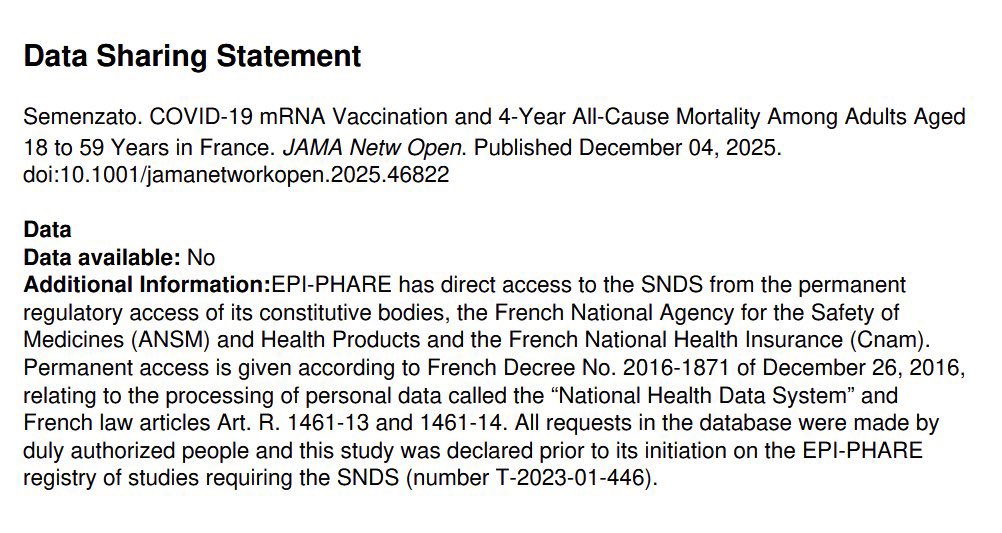2. Solo 1 autore, la dottoranda Laura Semenzato, ha avuto accesso ai dati sanitari di 28 milioni di francesi. Nessun altro, nemmeno i 10 coautori, li hanno VERIFICATI. In meno di due mesi, i revisori "indipendenti" di JAMA hanno "revisionato" i 28 milioni di dati che NON avevano.