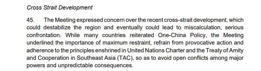 Note that the statement did not specify which strait or which actors, presumably doing so could be too sensitive. It notes that “many countries reiterated One-China policy,” but not Beijing’s “one-China principle.” asean.org/wp-content/upl…