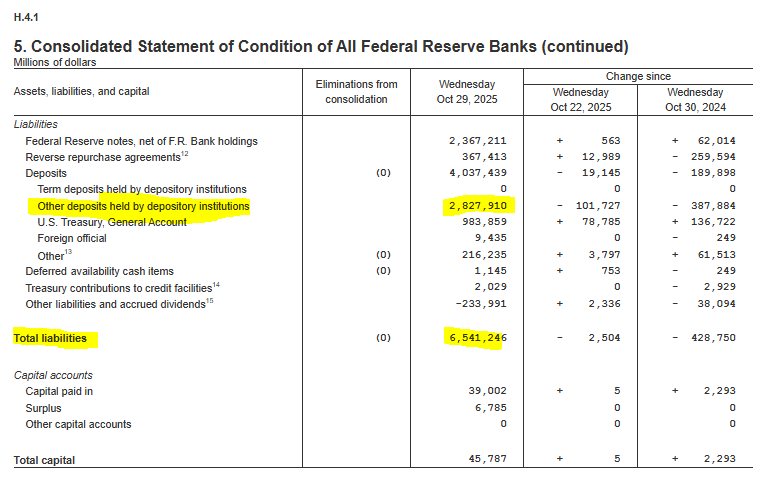 2/ קל לראות שההתחייבות הגדולה והחשובה ביותר, ס"ג של 43% מההתחייבויות כולן, היא מה שנקרא Bank Reserves. אם היינו עושים תחרות נזילות לכסף, הסעיף הזה היה יוצא במקום הראשון (שקט ביטקוין). לפני שטרות ומטבעות אפילו. זהו הכסף בצורתו הנזילה ביותר האפשרית. ורק הבנקים יכולים להחזיק בו.