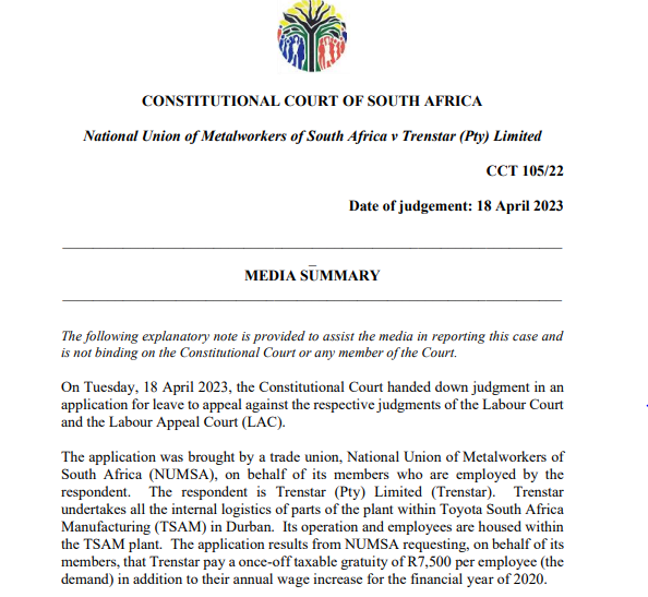(2/8) Accordingly, during the period that the employees of Trenstar (Pty) Limited (the respondent) suspended their strike, their exclusion from the workplace despite their tender of services was in terms of a lock-out.