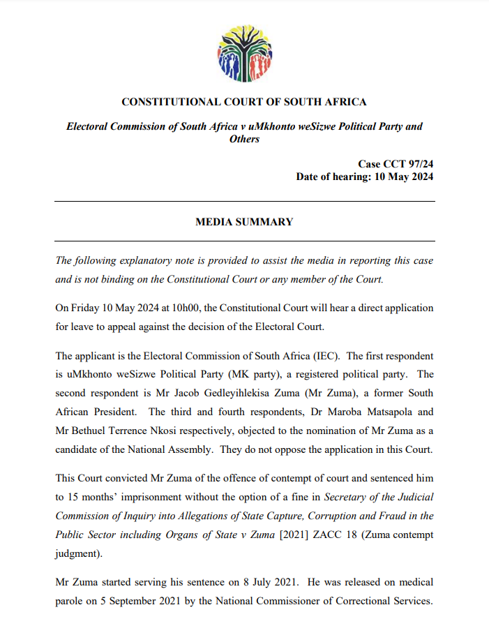 (1/6) Judgment on Monday, 20 May 2024 at 10h00: On a proper interpretation of section 47(1)(e), is Mr Zuma disqualified from standing as a candidate for the National Assembly?