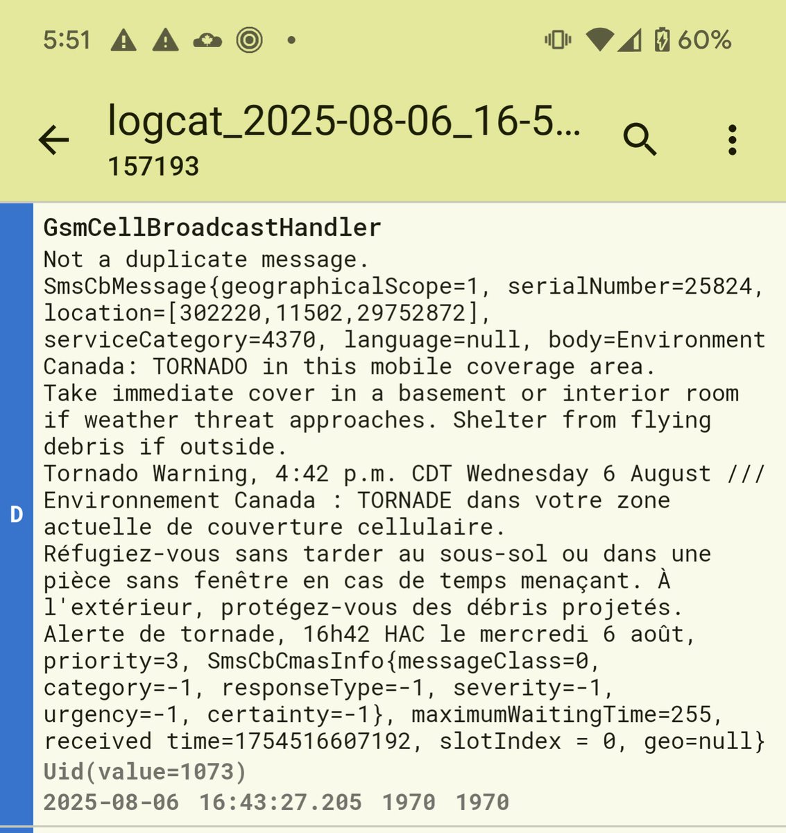 🧵 Debugging (or trying to...) erroneous Pelmorex @AlertReady tornado warning WPAs deep within Winnipeg, plus a peek at Android's CellBroadcastReceiver's plumbing - AKA @ConnorsCompShow's Steel Chair. As I don't wanna spam #mbstorm, click to read on, this'll be very lengthy...