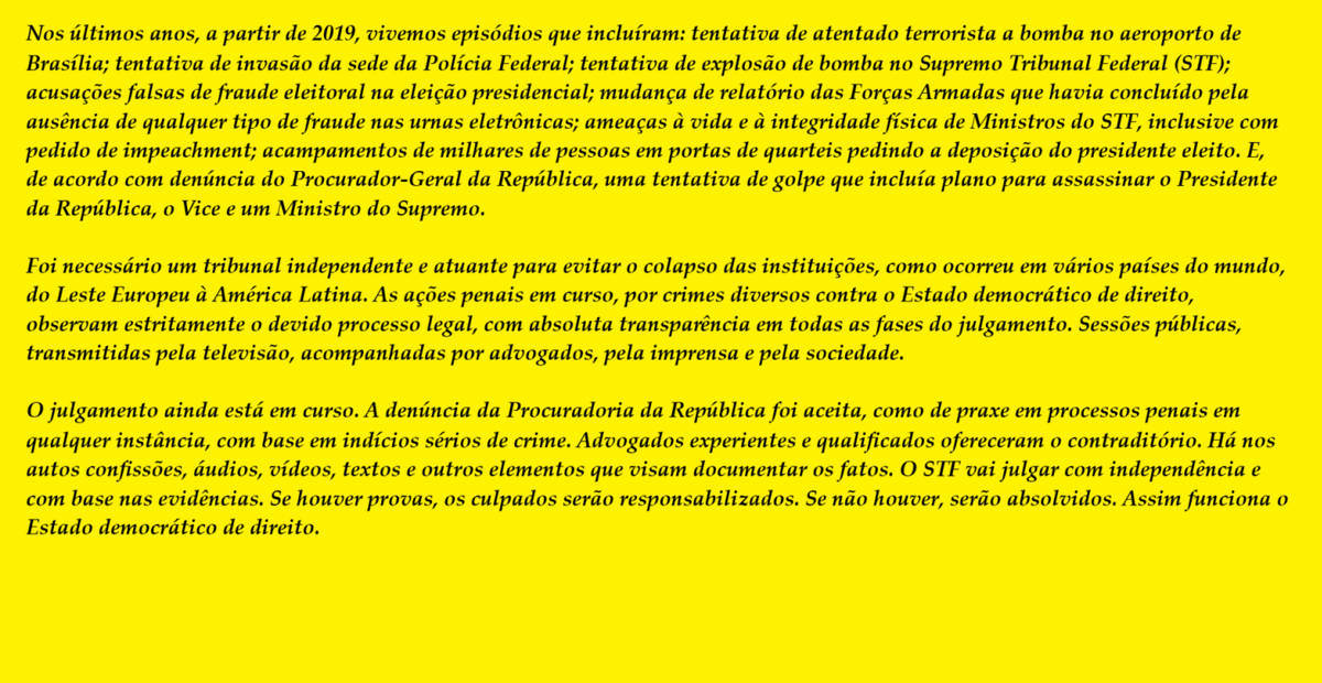“Em 9 de julho último, foram anunciadas sanções que seriam aplicadas ao Brasil, por um tradicional parceiro comercial, fundadas em compreensão imprecisa dos fatos ocorridos no país nos últimos anos. Cabia ao Executivo e, particularmente, à Diplomacia – não ao Judiciário – conduzir as respostas políticas imediatas, ainda no calor dos acontecimentos.”