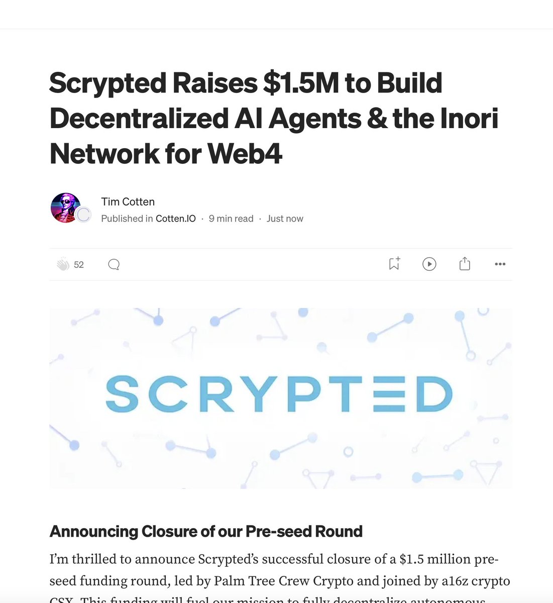 🤩 1/ I'm excited to announce that @scryptedinc has raised a $1.5M pre-seed round, led by @PalmTreeCrypto w/ participation from @a16zcrypto CSX, to build decentralized #aiagents and the Inori Network.