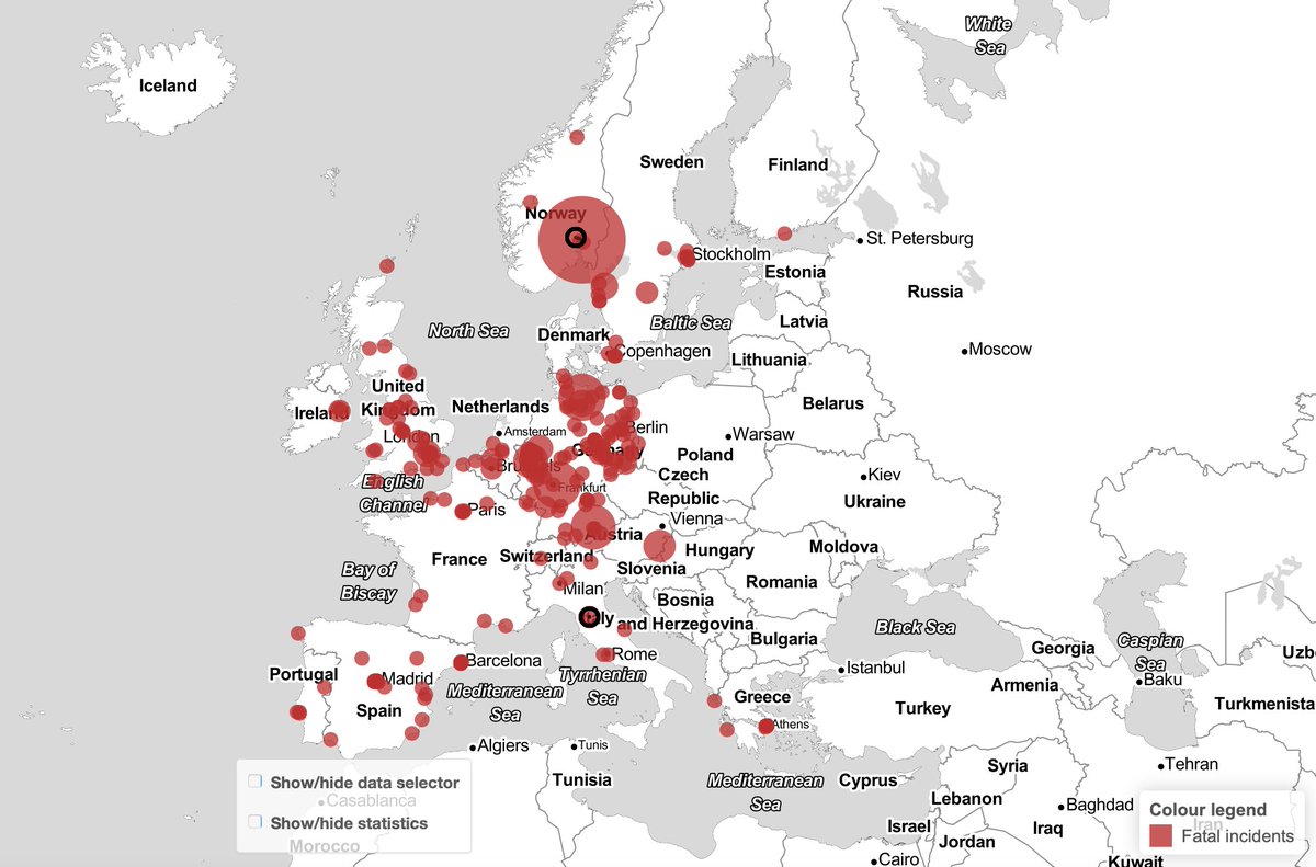 The RTV Map Tool, which is based on the Right-Wing Terrorism and Violence (RTV) dataset, contains information about all fatal right-wing incidents since 1990 (226 in total). 2/10