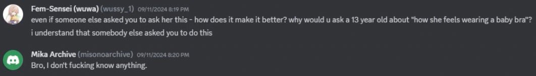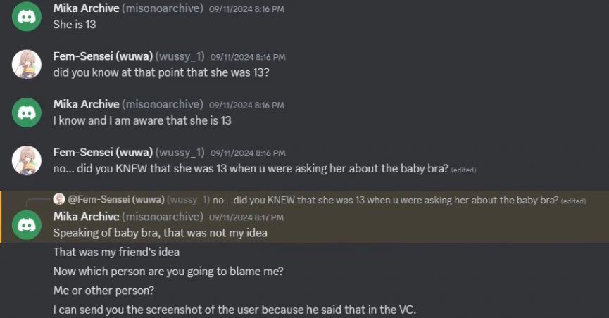 🧵(1/12)1. Here is SS of AzusaDev being confronted about asking AJinn (a 13 year old) about her bra. AzusaDev tries to go around the question, until finally admitting that he did ask "how she feels wearing a baby bra." Next he tries to push blame onto a user (who is 15 at this time).