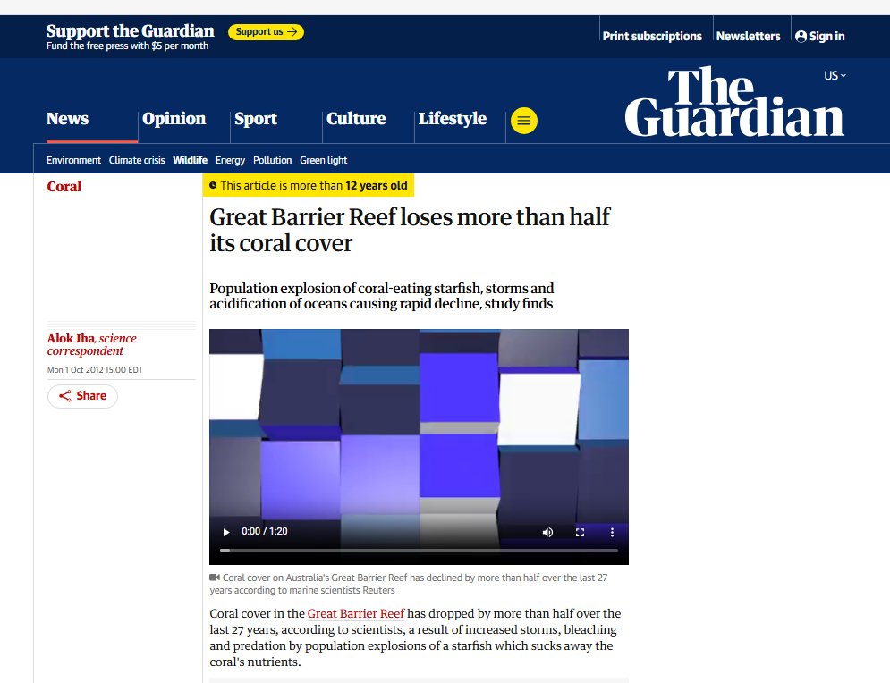 In 2012, a study published in the prestigious journal, PNAS, showed that the GBR had suffered a 50% decline in coral cover over a 27-year period. Climate scientists and the media ran with the horrors of acidifying seas and a warming climate.