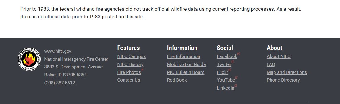 The National Interagency Fire Center keeps the official records for forest fires and area burned. According to the NIFC, there are no official records for forest fire area burned before 1983 and it won't provide that data.