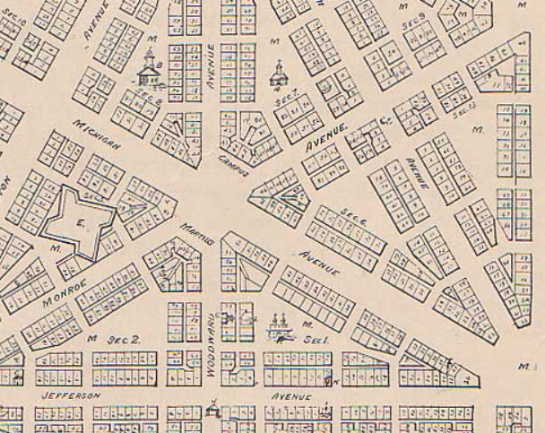 Between the days of the first fort and the layout we know today, there was Fort Shelby. It sat north of Savoyard Creek, the first creek to be buried & turned into an underground sewer. The angled fence follows today's Michigan Avenue.