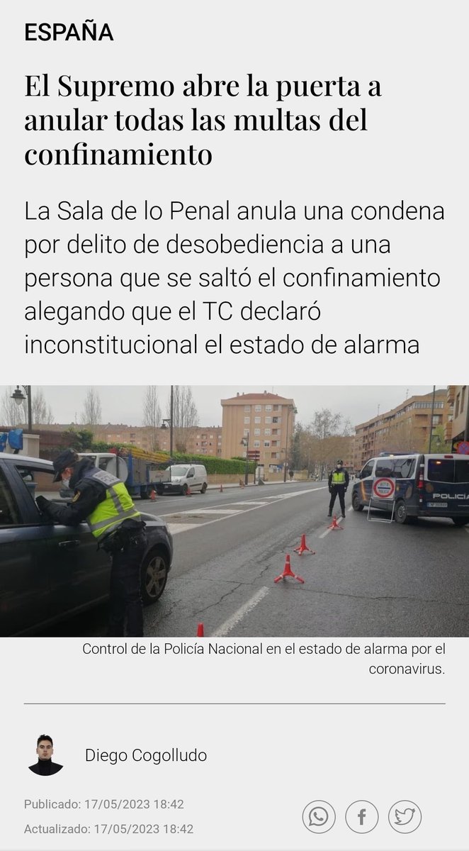 Todas las medidas LIBERTICIDAS aprobadas por el Gobierno bajo los estados de alarma inconstitucionales y las actuaciones individuales de los agentes de la autoridad han sido atropellos de los derechos y libertades de los ciudadanos,la desobediencia civil debió ser total.