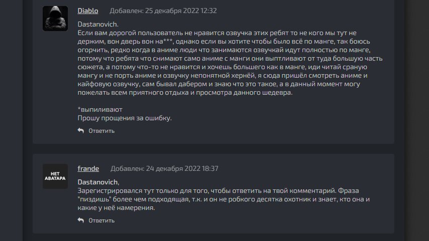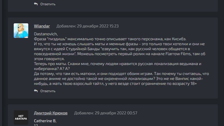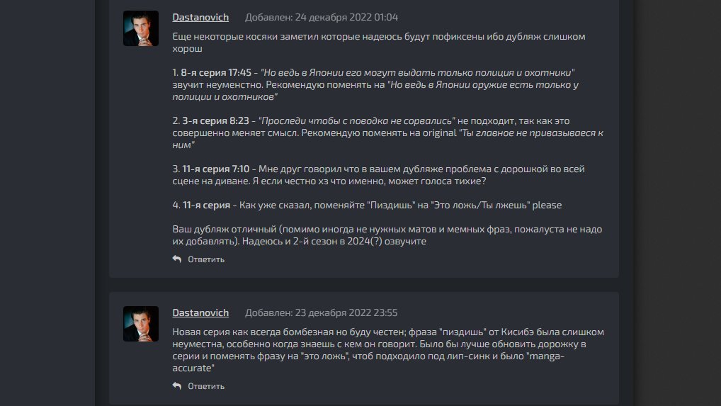 Их комменты под CSM были пустыней, вообще еле кто писал. Тут я решил просто сказать "Эй, ребят. Шикарный дубляж. Вот тайм-коды с некоторыми косяками, надеюсь по-фиксите и понизите маты в будущем" И... внезапно ДОХУИЩЕ комментов на меня пошло. Я был... в ахире от них