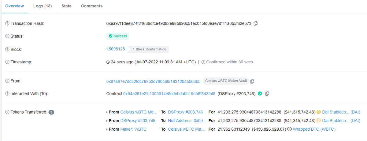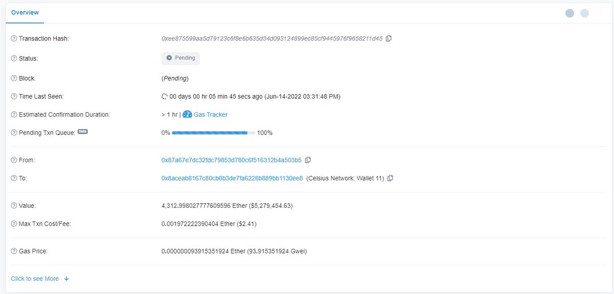 https://twitter.com/DeFiyst/status/1536723552543588355P.S. Celsius didn't pay enough gas for this TX. 4.3k Ether still pending ($5.3m)