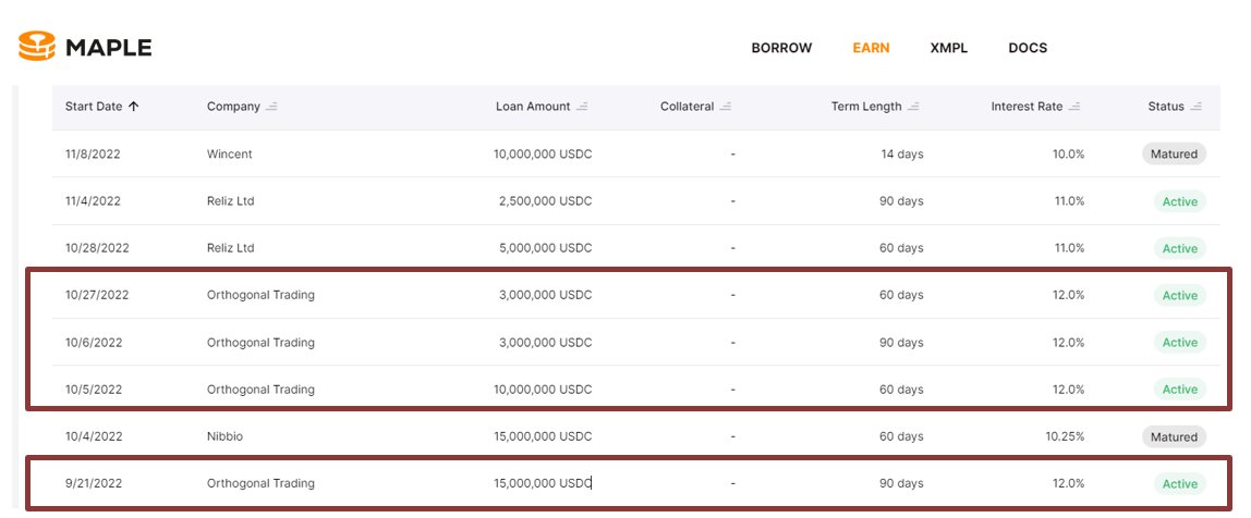 Orthogonal is currently 80.5% of liabilities in the $38.5m M11 USDC pool. Relative to the Babel default post LUNA collapse, which was low single digits % loss, this is magnitudes worse for Maple LPs (the majority of whom are likely retail)