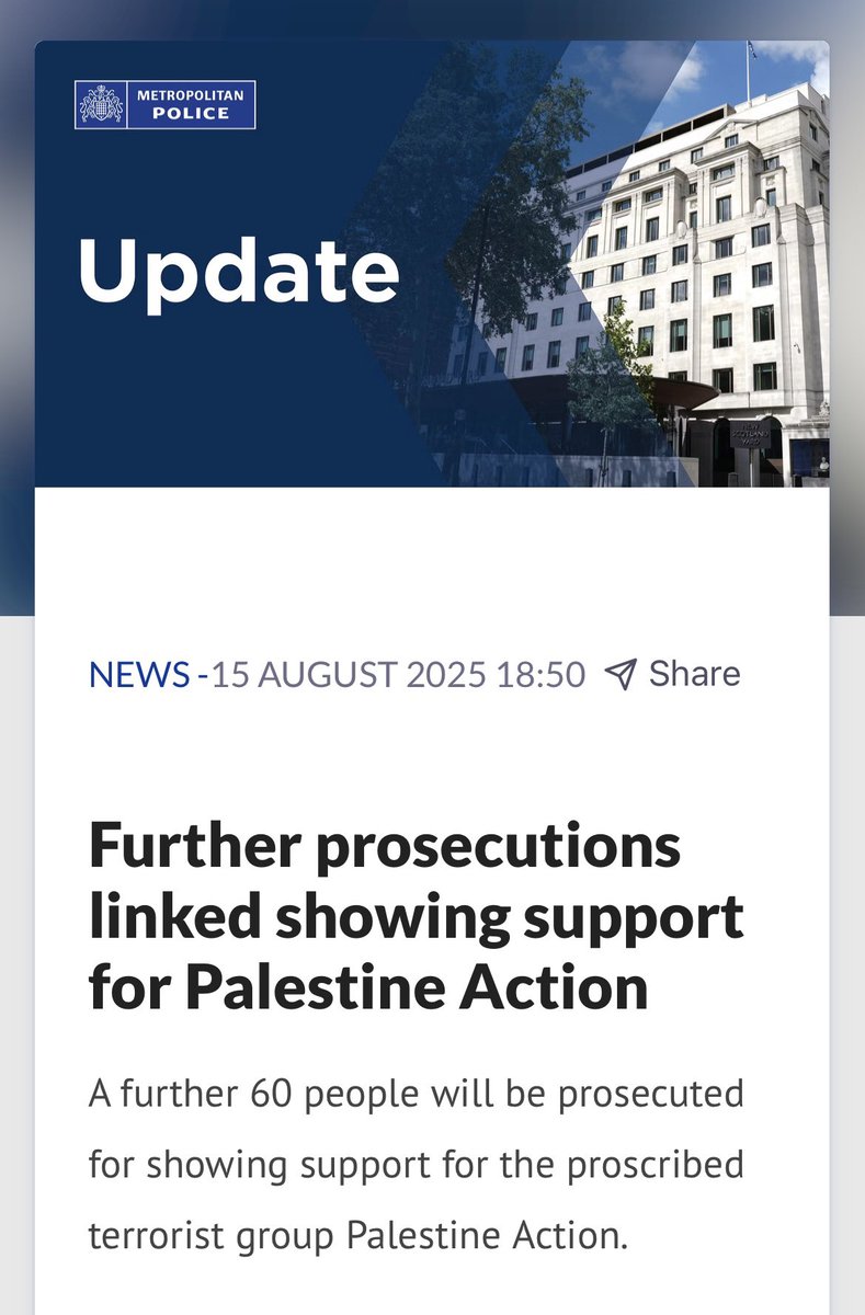 The Met Chief, Sir Mark Rowley, says he is ‘proud’ that of the 700 protestors arrested for holding signs since 5 July people, 60 have now been charged.