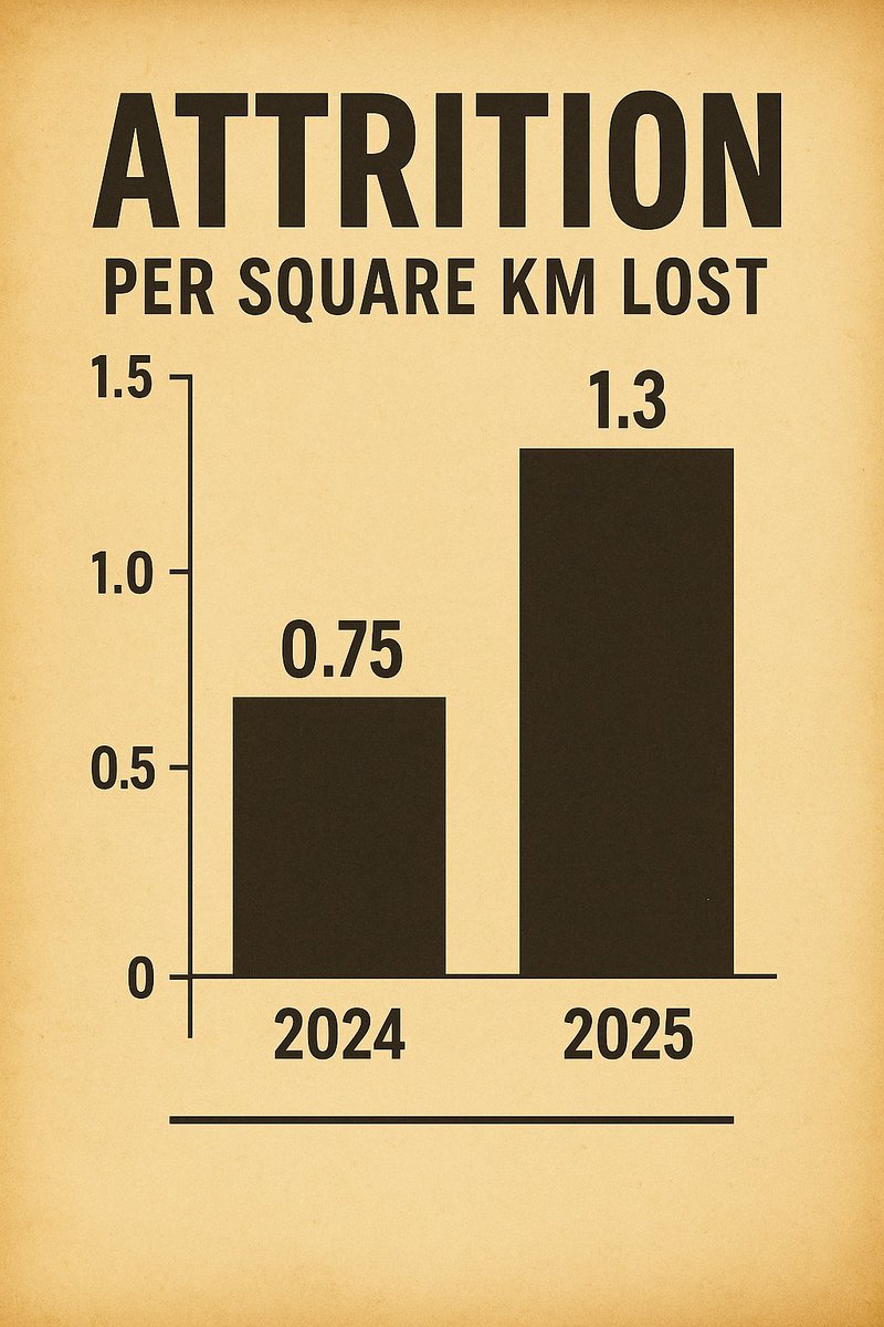 🇺🇦is now taking its highest equipment losses per km2 defended. In 2024, losses averaged 0.75 per km² lost. In 2025, that figure has risen to 1.3. Logistics, rotations, reinforcements are increasingly exposed. This trend is cumulative and accelerating.
