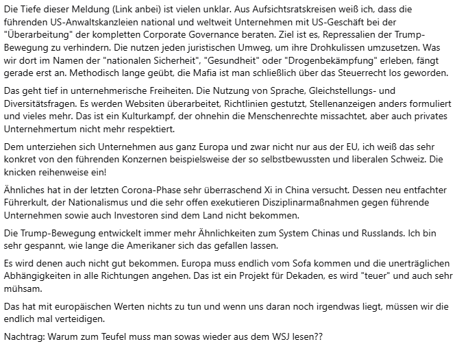 Die Tiefe dieser Meldung (Link anbei) ist vielen unklar. Aus Aufsichtsratskreisen weiß ich, dass die führenden US-Anwaltskanzleien national und weltweit Unternehmen mit US-Geschäft bei der "Überarbeitung" der kompletten Corporate Governance beraten.