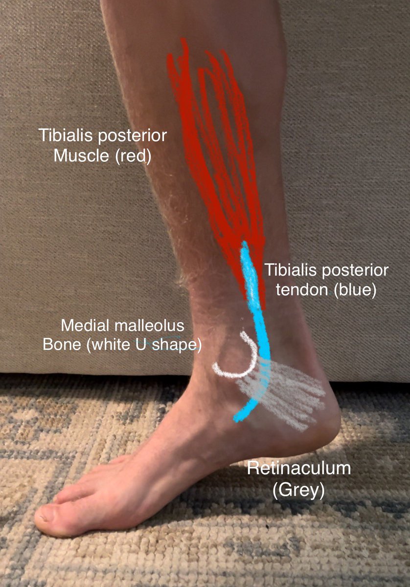 The tibialis posterior tendon (which I will shorten to tib post) typically sits behind the bumpy bone on your inner ankle, the medial malleolus. If the retinaculum tears, the tendon can pop on top/in front of the malleolus. (2/?)