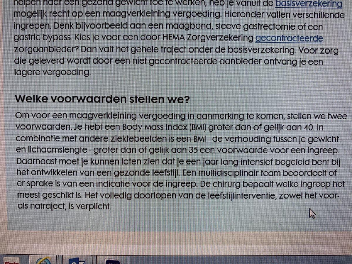 Meeste zorgverzekeraars vergoeden een gastric bypass (maagverkleining) pas vanaf een BMI van 40. Dat is dus bijv. 122 kilo bij 1.75 meter. Nu had ik dus een patiënte die in de situatie kwam dat ze eerst 6 kilo moest AANKOMEN voordat ze op de wachtlijst geplaatst kon worden. (1/4)