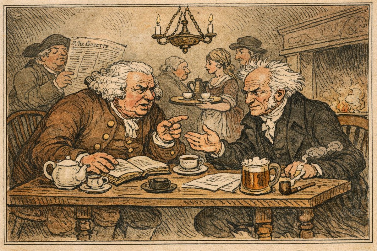 (The Vicar of Wakefield), Joseph Banks (who sailed with Captain Cook), Adam Smith (The Wealth of Nations), Sir Joshua Reynolds (the painter), Charles Fox (politician), Richard Brinsley Sheridan (dramatist), David Garrick (Shakespearean actor) and Edward Gibbon (yes, that Gibbon).