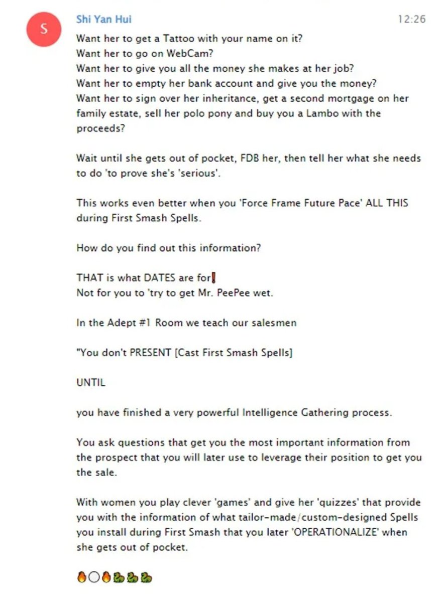 The message, written by senior member Iggy Semmelweis (aka Miles Sonkin aka Shi Yan Hui), describes a step-by-step process to manipulate women into giving away their money, assets, and even their bodies. The language is dehumanising and predatory.