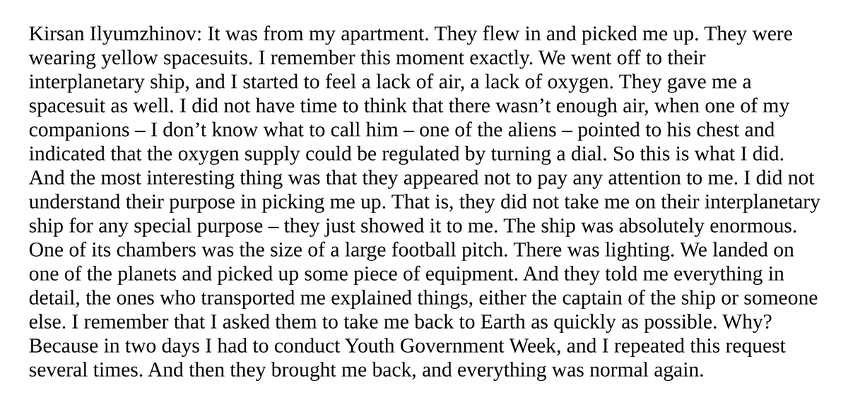 In an interview with Radio Free Europe (lol), he describes the voyage in an enormous flying saucer. The aliens, wearing yellow spacesuits, took him to other planets and "explained everything to him"