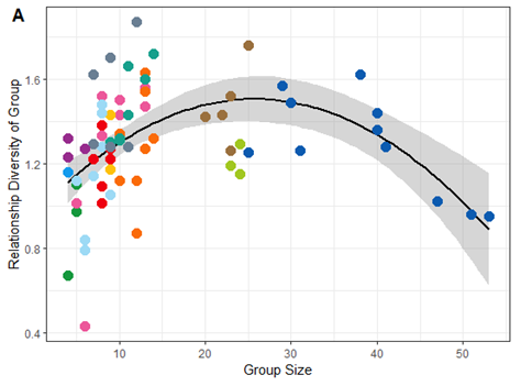 We compared metrics of social complexity based on relationship diversity with the traditional metric of group size across 13 mountain gorilla groups over 12 years and found that relationship diversity was actually lowest in some of the largest groups (2/7)