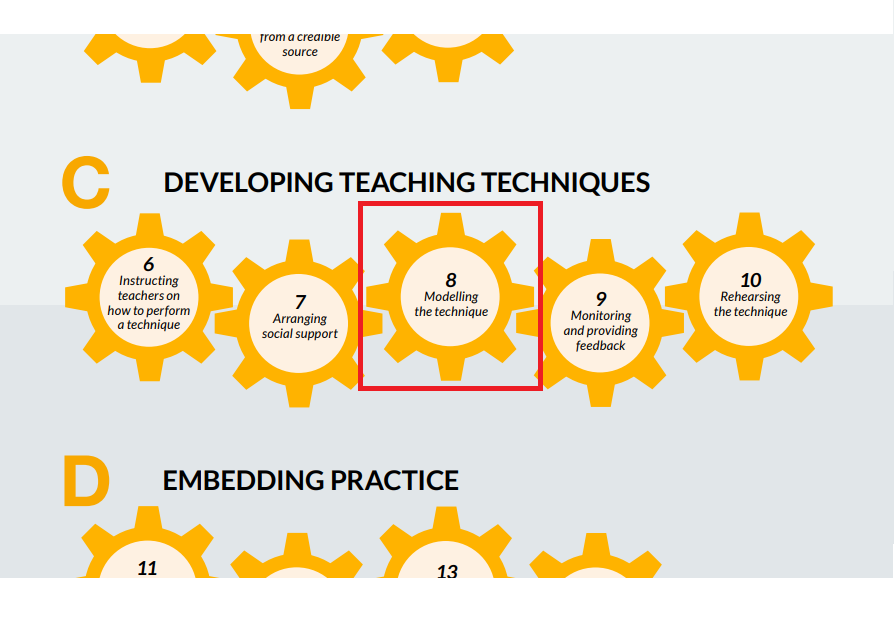 Models are observable examples of a specific teaching practice. They are thought to help teachers develop a 'mental image' of a teaching technique, which can help bridge the theory-practice gap.