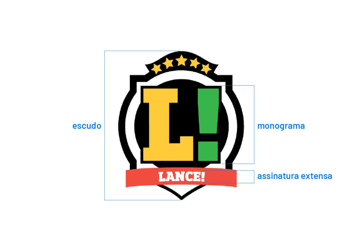 O logo antigo é um escudo q reúne o monograma L+! e a assinatura por extenso LANCE!.