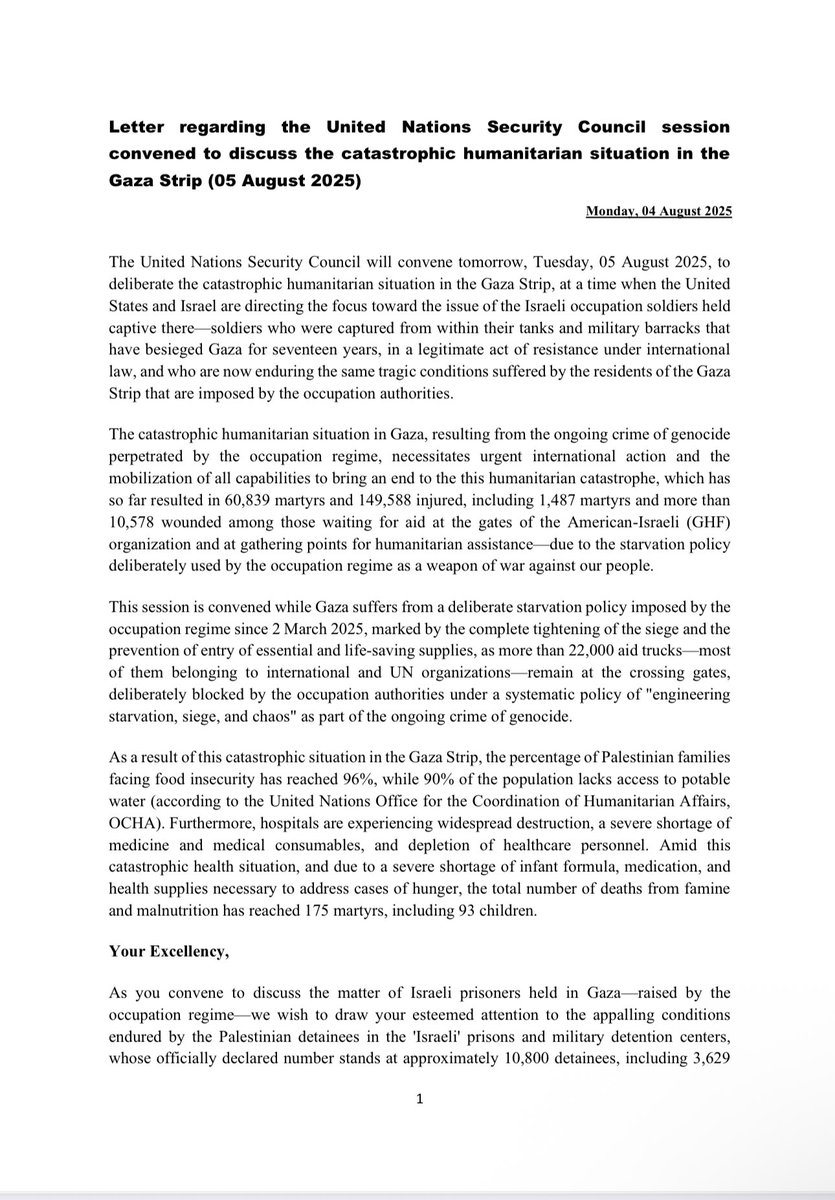 📌 Letter regarding the United Nations Security Council session convened to discuss the catastrophic humanitarian situation in the Gaza Strip (05 August 2025)