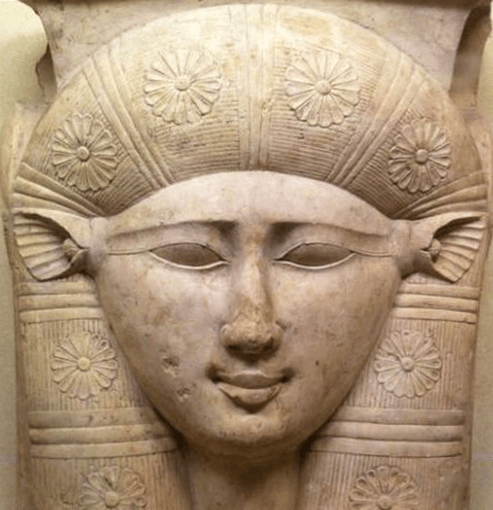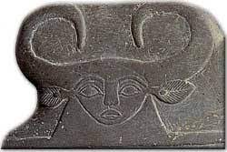 Hathor shares Her frontality with Bes, who is closely linked to Her in the Returning Goddess rites. (The image of Bes on the left comes from the great temple of Hathor at Dendera.) Hathor inherits Her frontal iconography from Bat, who we see in a Predynastic depiction at right.