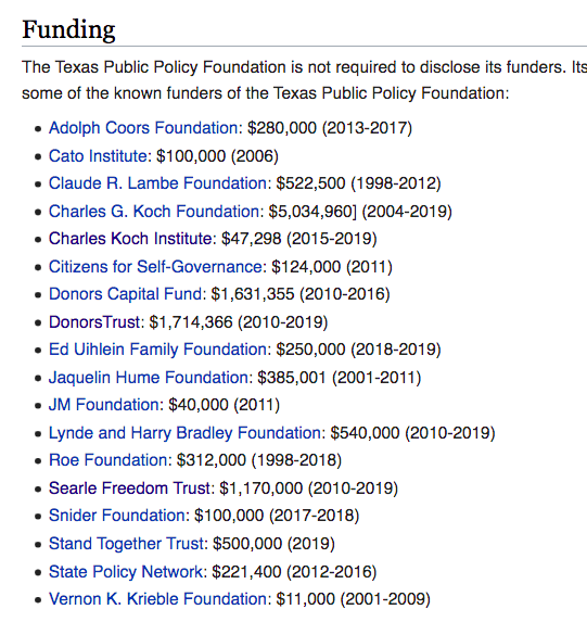 Here's some info on the billionaire-funded "think tank." sourcewatch.org/index.php?titl…@TPPF 2) TPPF has ties to the fossil fuel industry, is active in ALEC, and has been financed by major right-wing funders Charles Koch, Richard Uihlein, the Bradley Foundation & DonorsTrust, which funds white nationalist groups. sourcewatch.org/index.php?titl…