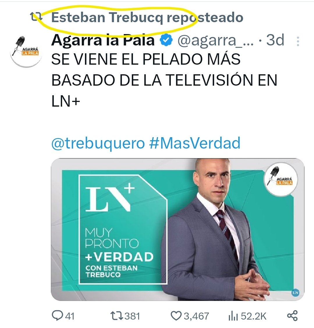 Otro que suele repostear a estos trolls pagos es Esteban Trebucq, recientemente incorporado a LN+. Trebucq no solo réplica, sino que les agradece cuando lo citan. Vergüenza ajena.