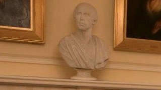 1️⃣ Sobre la escena, un busto de Washington romanizado.