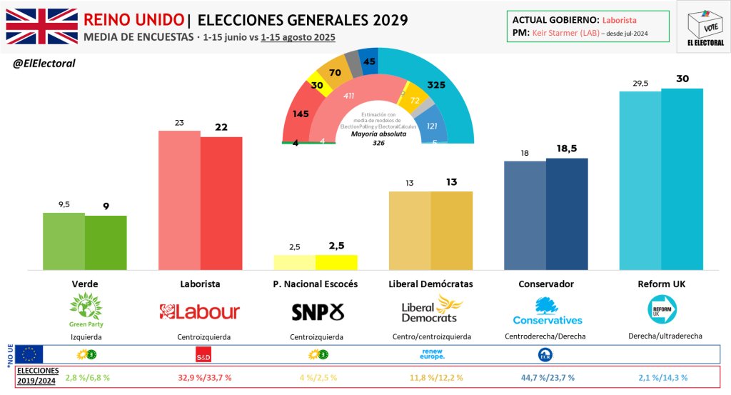 (1/9) Reform lidera actualmente las encuestas en el Reino Unido.