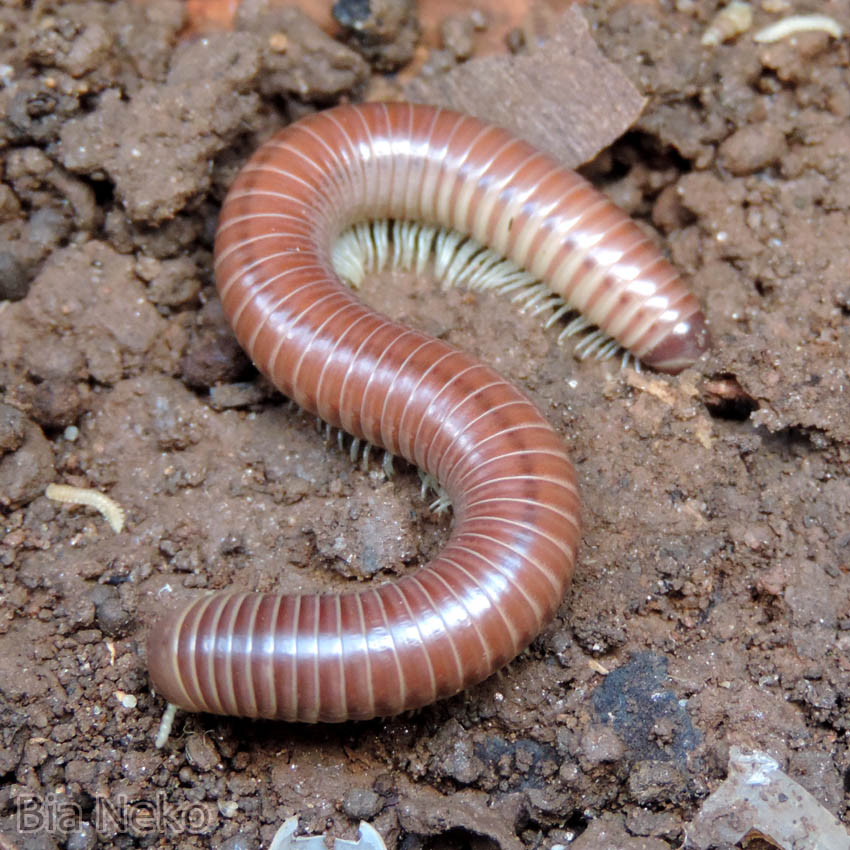 2 - Piolhos-de-cobra marrons/ Diplopoda, são muito comuns em quintais ou jardins, adoram viver sob pedras e madeiras onde há umidade. Eles comem detritos/vegetais em decomposição e são inofensivos.