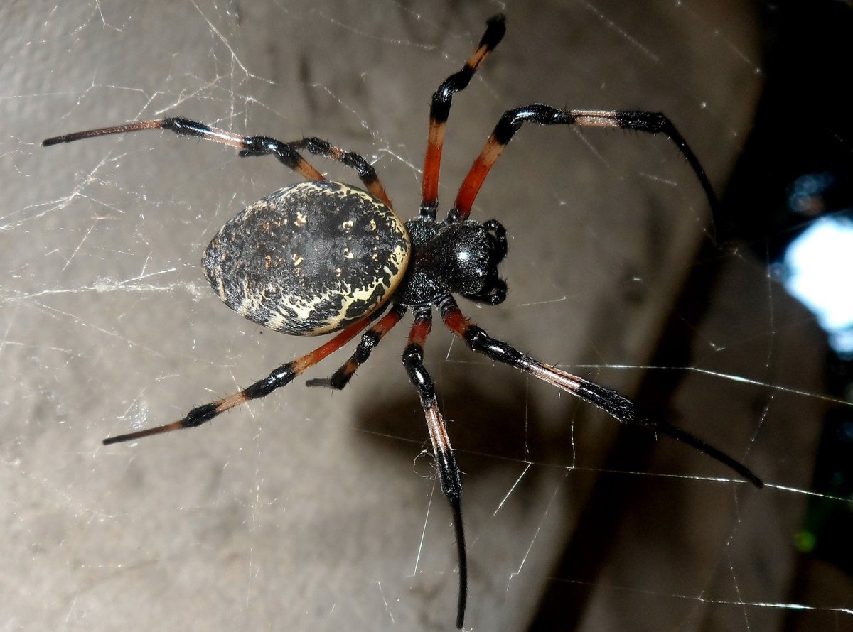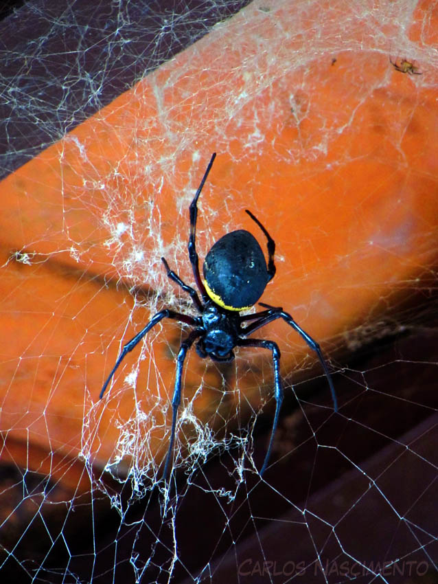 Aranha-de-telhado/ Nephilingis cruentata. Adora um telhado. Muito comum em nossa casa. Faz um abrigo como se fosse um copinho de teia, onde pode ficar escondida nele. Arma uma teia maior do lado de fora do abrigo para pegar bichinhos para comer. Uma querida inofensiva.