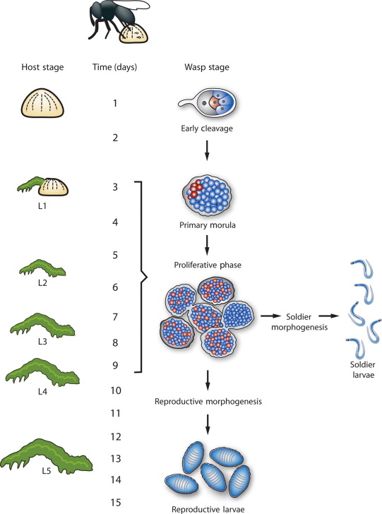 https://twitter.com/KindLittleBug/status/1596313199129034752Elas colocam um ovo dentro de uma lagarta de mariposa no estágio de ovo. A partir do ovo da vespa, forma-se a mórula, onde vários embriões se multiplicam por mitose, até formar as larvas. Uma lagarta de cerca de 5 cm pode conter até cerca de 3.000 larvas, e todas elas são clones.