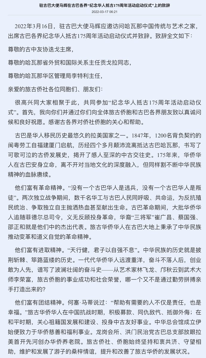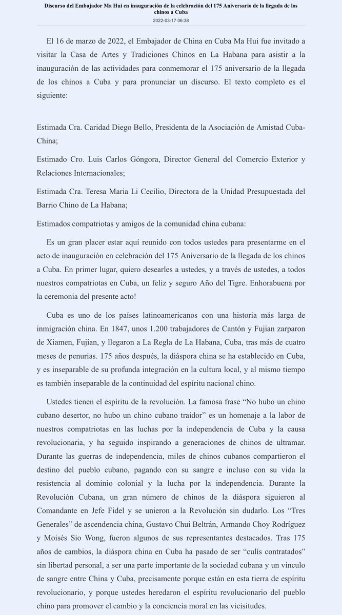 2/4 En la Casa de Artes y Tradiciones Chinas, Emb. Ma Hui se reunió colectivamente con representantes de la comunidad china y pronunció un discurso enfocado en celebrar el 175 aniversario de la llegada de los chinos a Cuba.