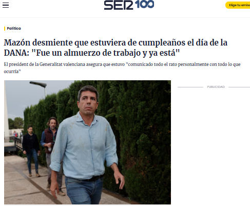 Mazón ha dicho hoy que estaba en una comida de trabajo, una comida que no tenía agendada porque su previsión era tener toda la tarde libre.