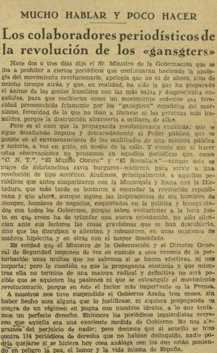 Los periódicos revolucionarios, propagadores del Golpe, apenas eran molestados por el ejecutivo de Lerroux.