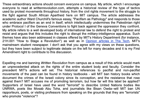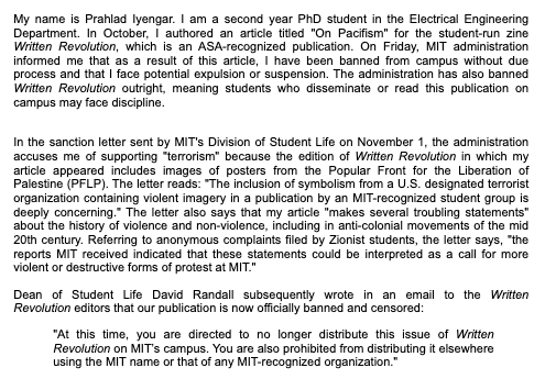 MIT suspends student & bans student publication for article opposing Gaza genocide, claims article supports "terrorism."