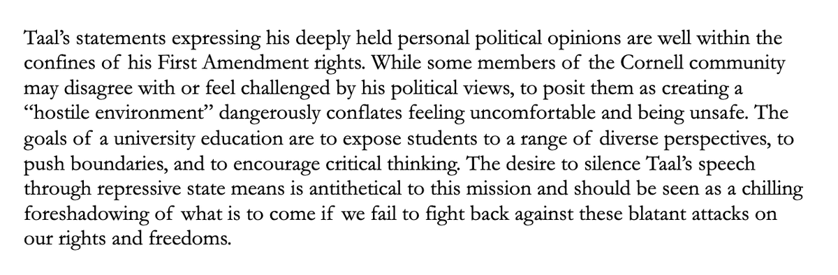 🧵Powerful statement by Jewish Cornell students, faculty & alumni opposing Trump's claim that Momodou Taal has created a "hostile environment for Jewish students" by protesting for Palestine.