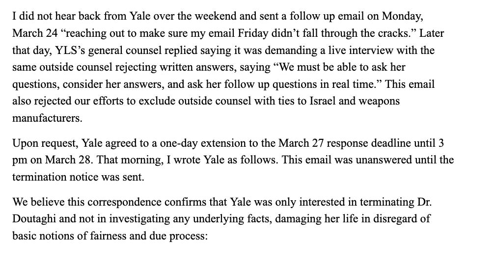 It is not true, as Yale alleges, that Dr. Doutaghi refused to answer questions or was non-cooperative. Yale made a decision to fire her without a fair process. Another capitulation to Trump by a major university.