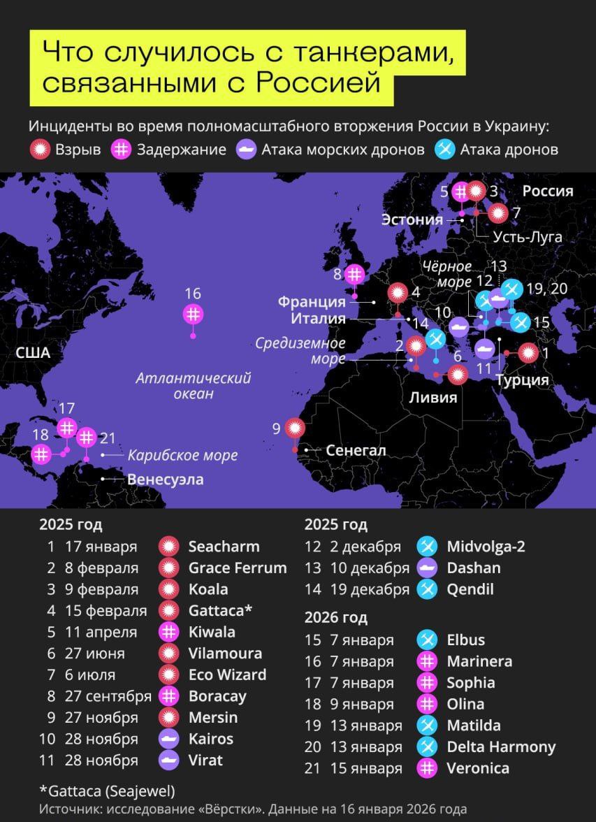 Desde principios de 2025, según cálculos de «Verstka», al menos 20 petroleros civiles que entraron en puertos rusos o que estaban relacionados con el «flota fantasma» de países, sufrieron ataques externos: ataques, detenciones o explosiones.