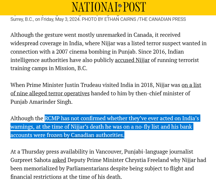 2/ In 2016, #Nijjar was placed on #Canada’s No Fly List, with his bank accounts frozen due to allegations of involvement in "terr0r training camps." This marked the beginning of serious scrutiny into his activities.