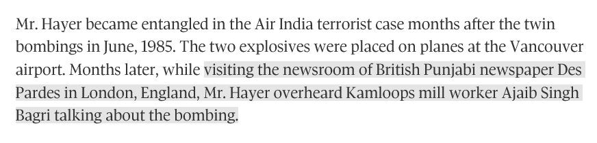 2/ In 1985, while visiting Des Pardes newspaper in London, Hayer overheard Ajaib Singh Bagri discussing the bombing. This discovery drove Hayer to investigate further, revealing Bagri’s connections to the bombing & BKI, despite increasing threats to his safety.