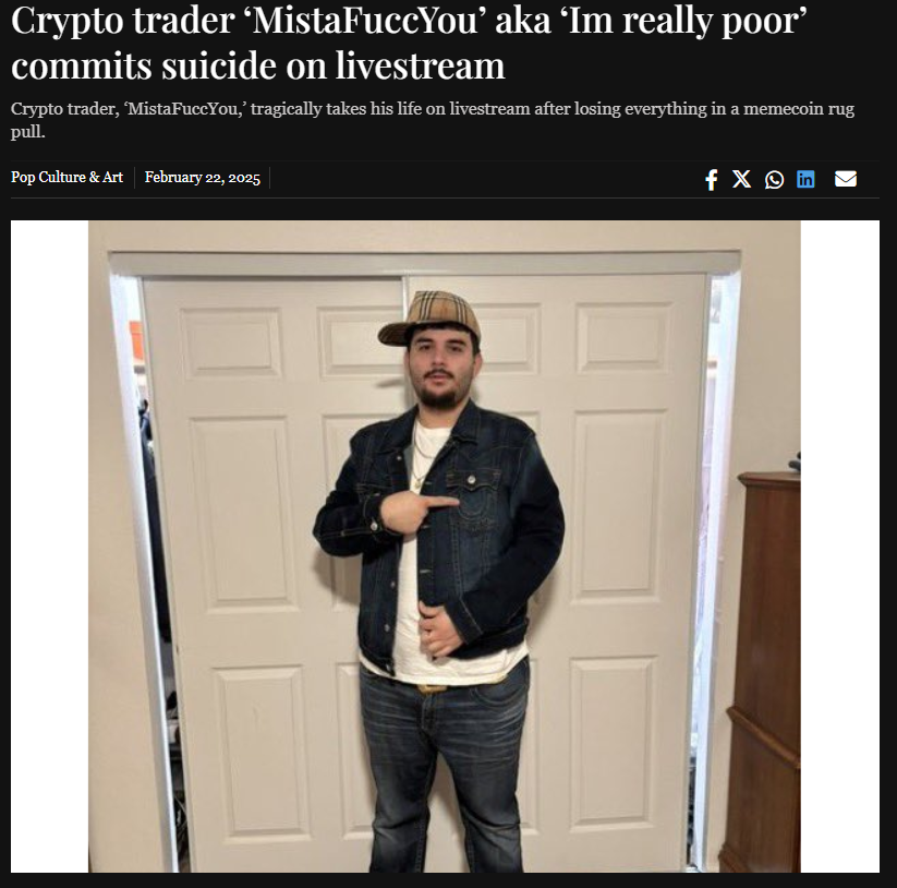 القصة تبدأ من شخص عمره 23 عام، لديه حساب في منصة X وهو @MistaFuccYou هذا الشاب كان يضع أمواله في العملات الرقمية الجديدة "عملات الميم" على أساس ترتفع بشكل كبير ثم يبيعها على أمل الثراء السريع، وظل يفعل ذلك في تصرف يشبه القمار حتى خسر جميع أمواله.