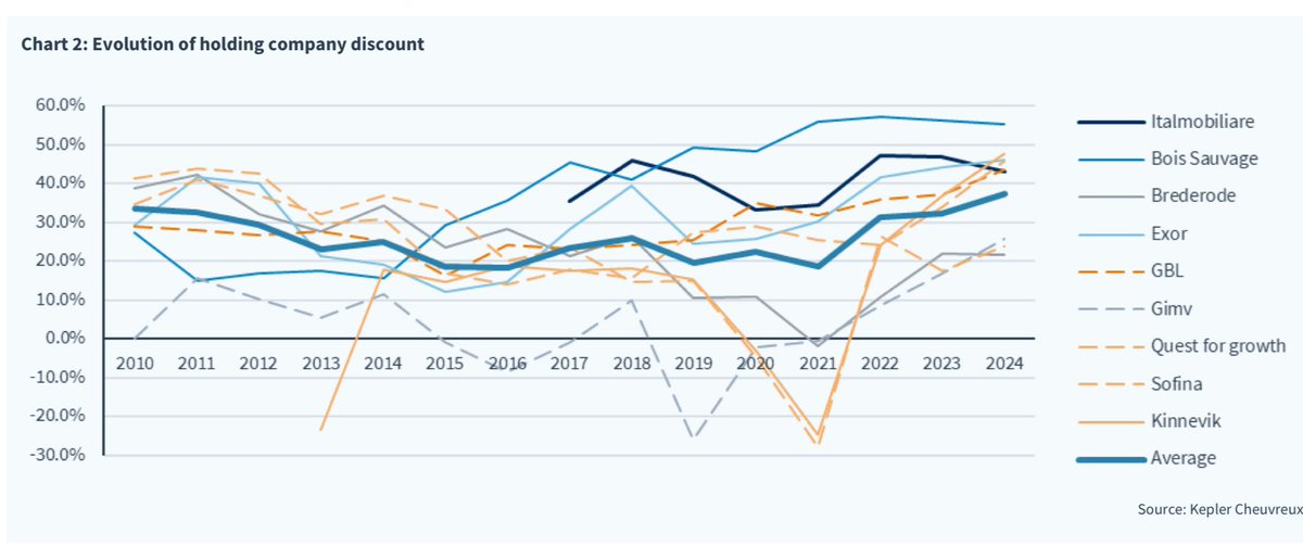 As shown in the above chart, holding company discounts can fluctuate widely with a broad dispersion. Current average of the sample is ca. 40% for a “generally accepted standard” of 25%. 2/n