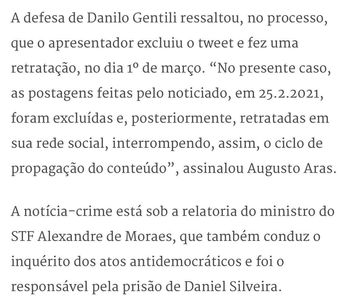 A notícia-crime ficou sob a relatoria do ministro Moraes que pediu a sua PRISÃO, Aras no entanto, negou e pediu a proibição das redes sociais, ENQUANTO o processo estava sob apuração.